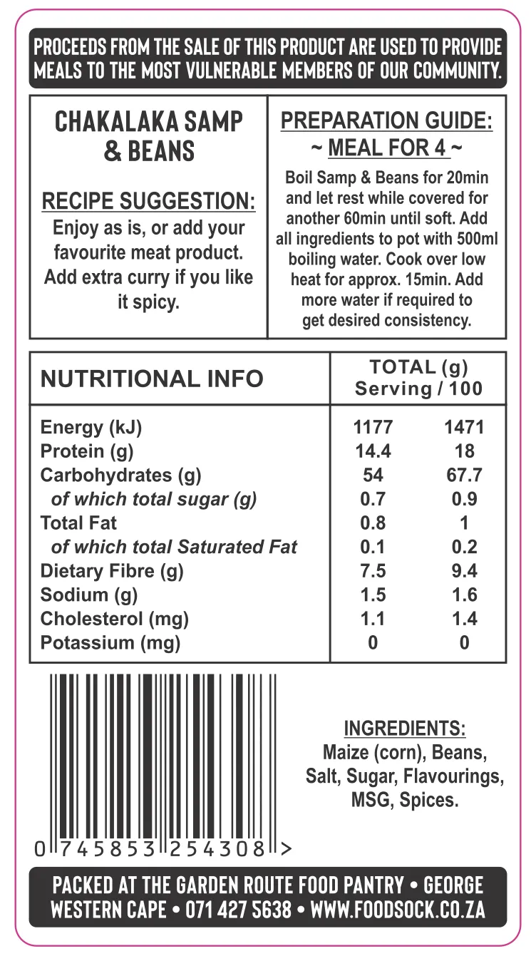 Each food sock feed 4 adults or 6 to 8 children. Nutrient rich, easy to prepare meals that cater to the diverse dietary needs of our communities. Simply add water and cook.