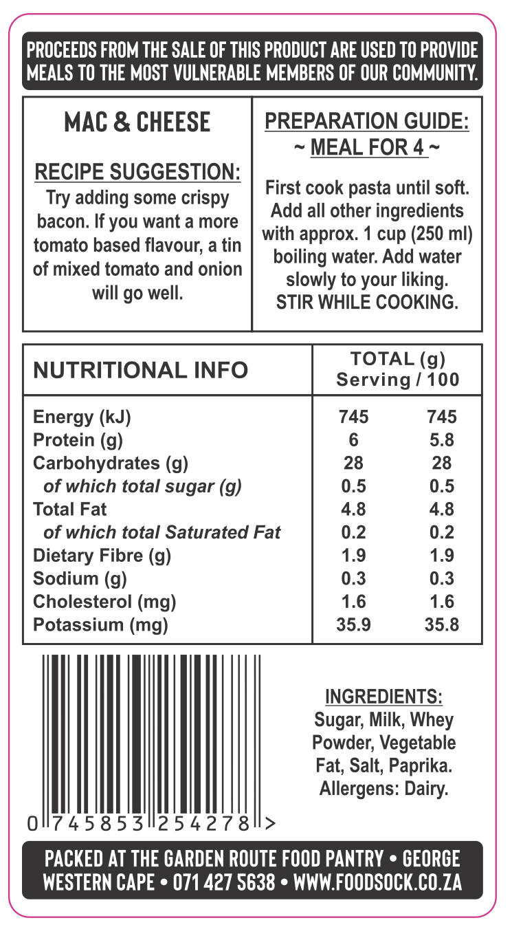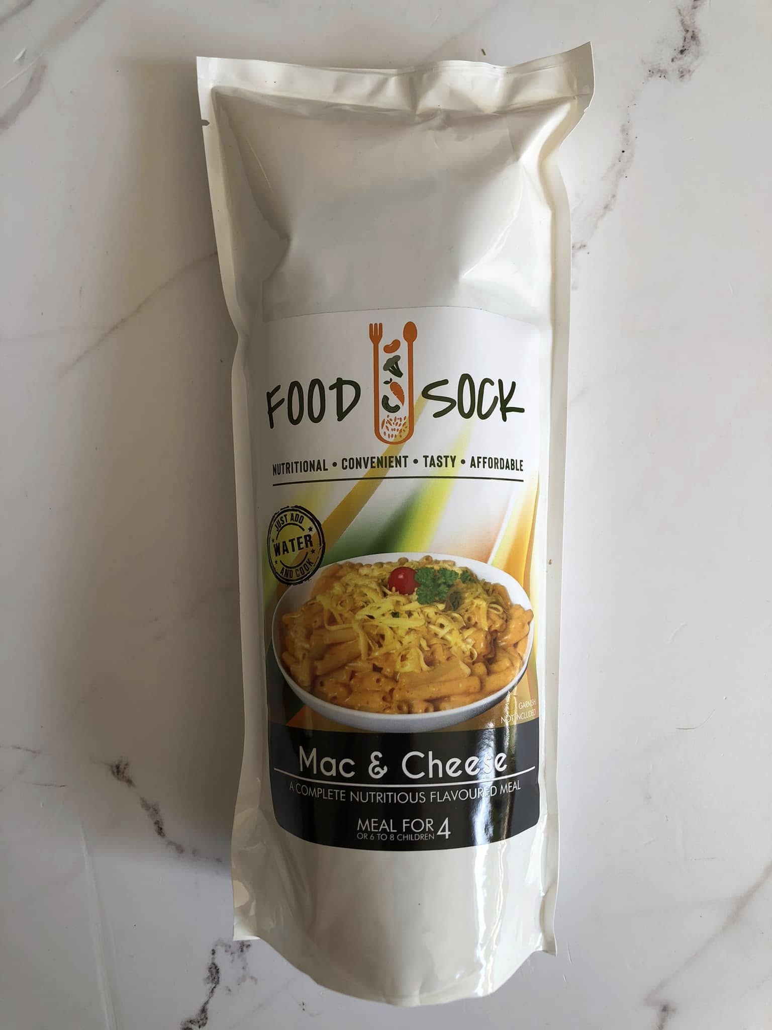 Each food sock feed 4 adults or 6 to 8 children. Nutrient rich, easy to prepare meals that cater to the diverse dietary needs of our communities. Simply add water and cook.